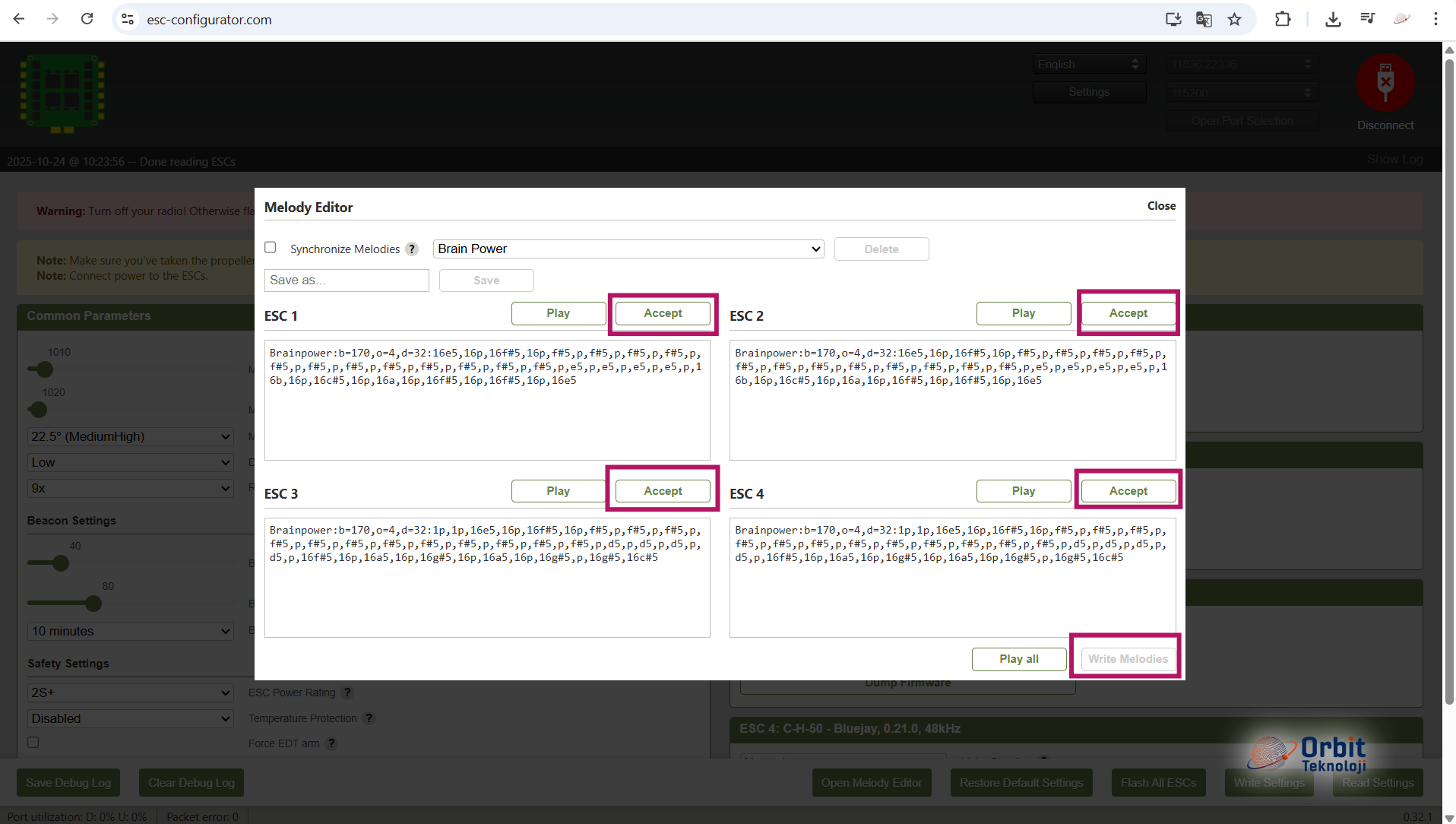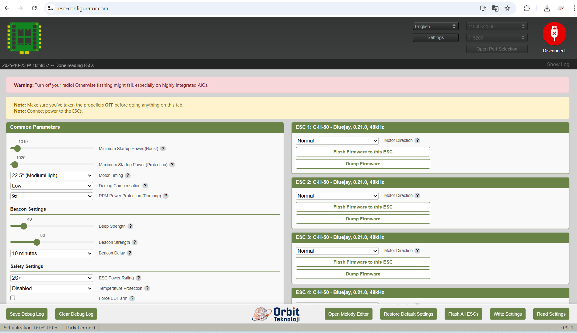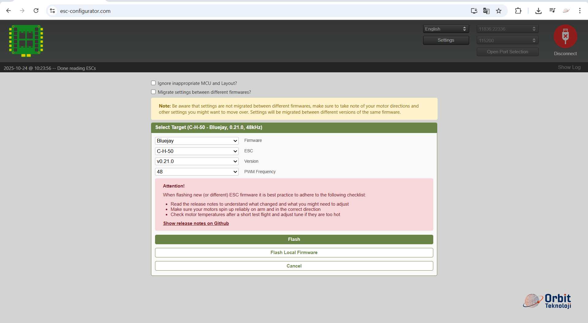 - Eğer tüm ESC’ler “Unknown” ise ve doğru hedefi bilmiyorsanız bu yöntemi kullanmayın (yanlış firmware ESC’yi bozabilir).